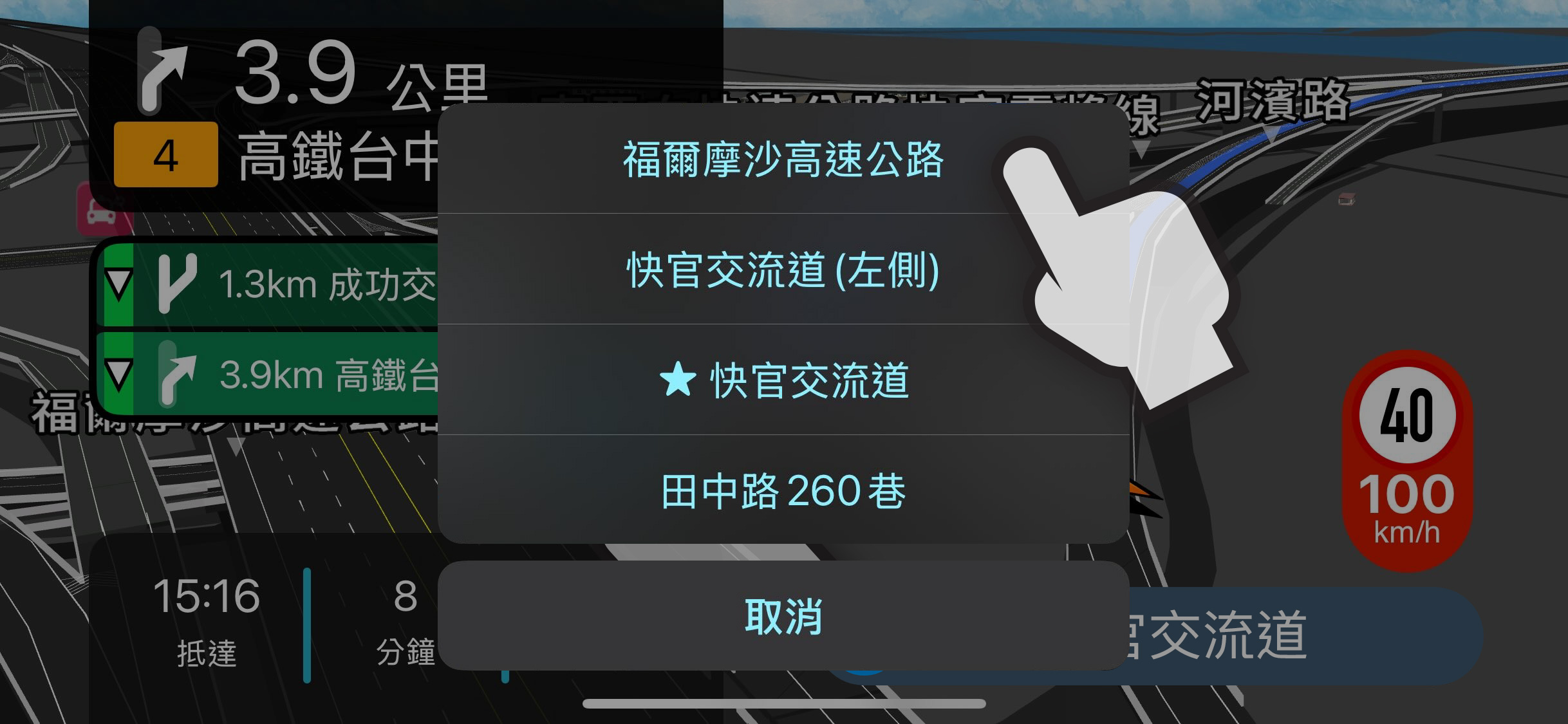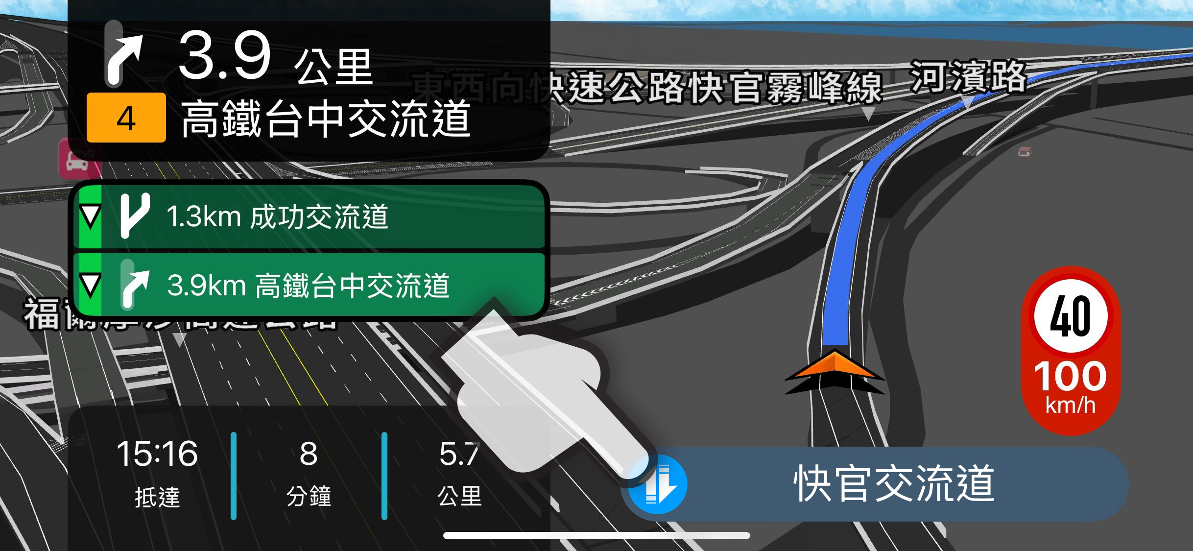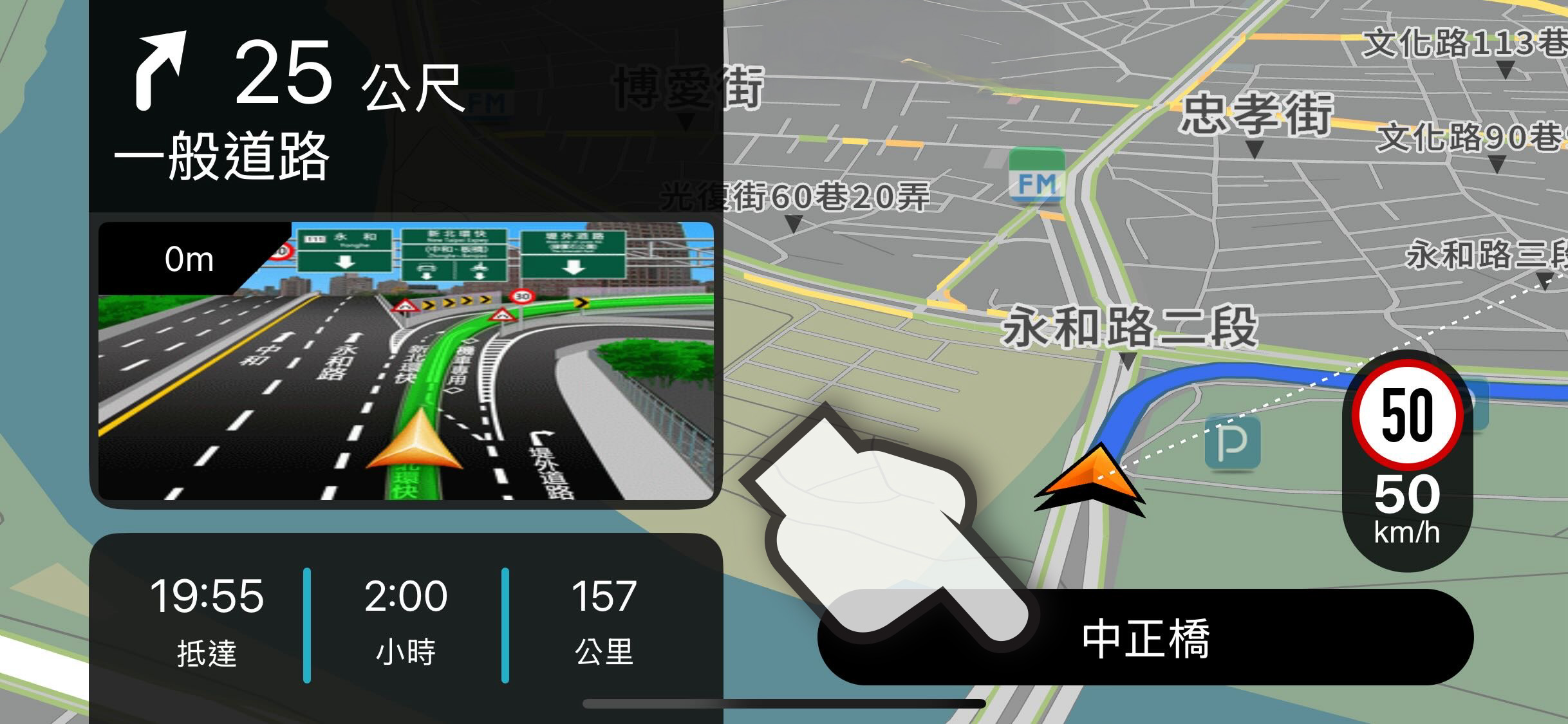 行經路段有「高架/平面」或「快/慢」道路重疊時,地址列會變色為藍底且有「切換車道」圖示,此時系統自動偵測行駛中道路,也可手動點擊切換,無論是複雜高架路段,還是多層道路情境,手指輕點就能切換正確車道!