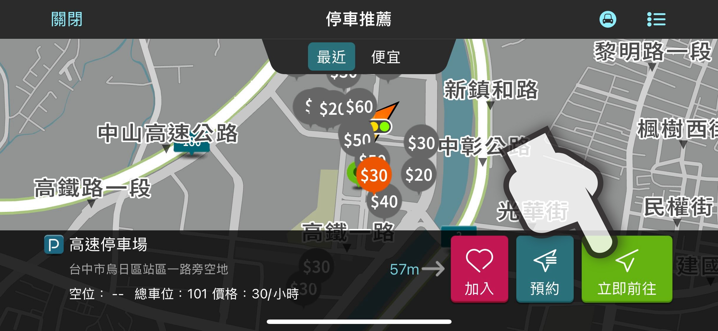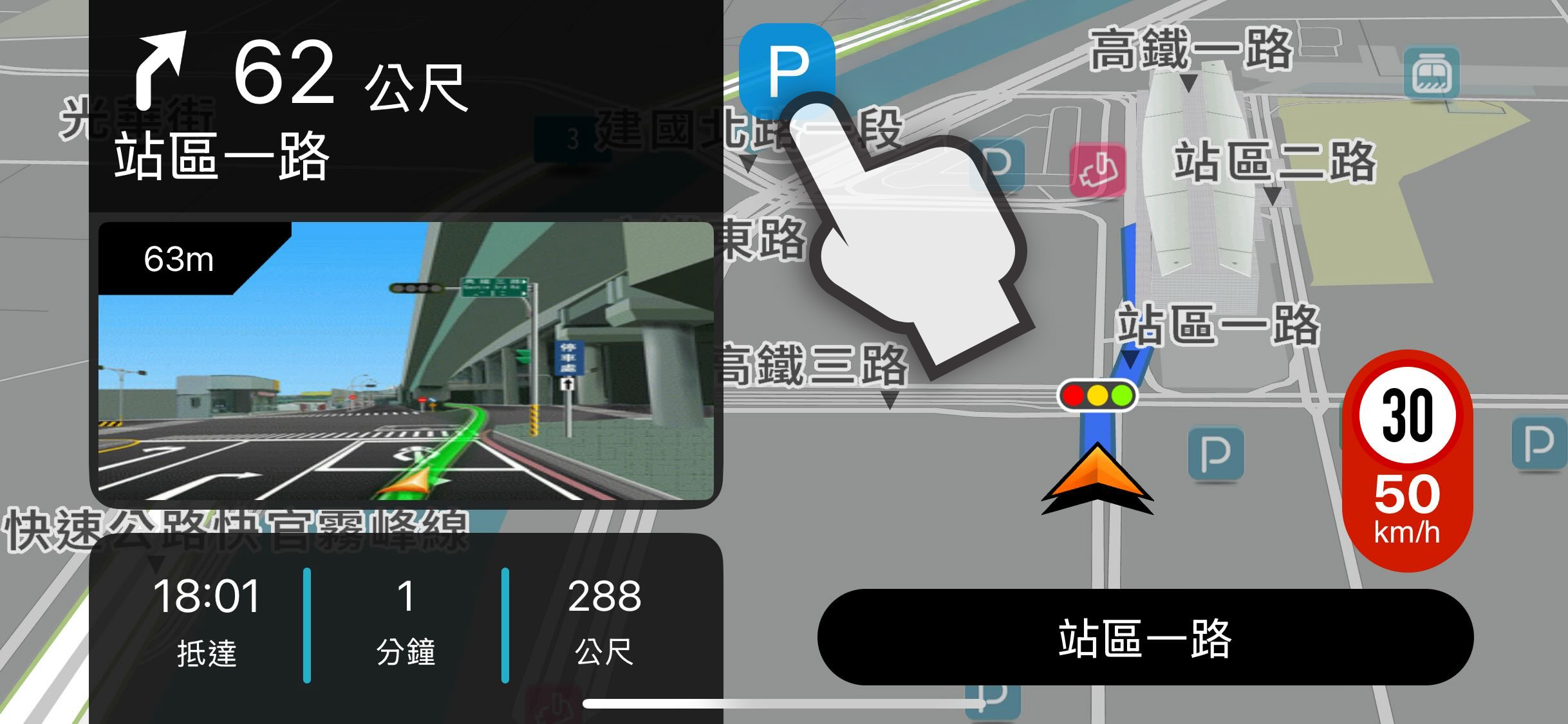 接近目的地時,語音會主動提醒「接近目的地,啟用停車推薦!」且地圖同步出現停車推薦圖示,點擊顯示附近停車場,輕鬆導航前往,幫你省下繞圈時間與油錢,多喝一杯手搖飲~