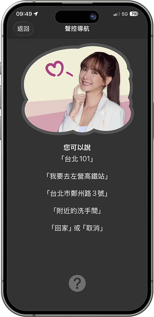 - 點選地圖上的「麥克風」圖示按鈕,即可進入聲控畫面開始使用。系統會依據您在設定中的播報語言設定,提供對應的互動語音。