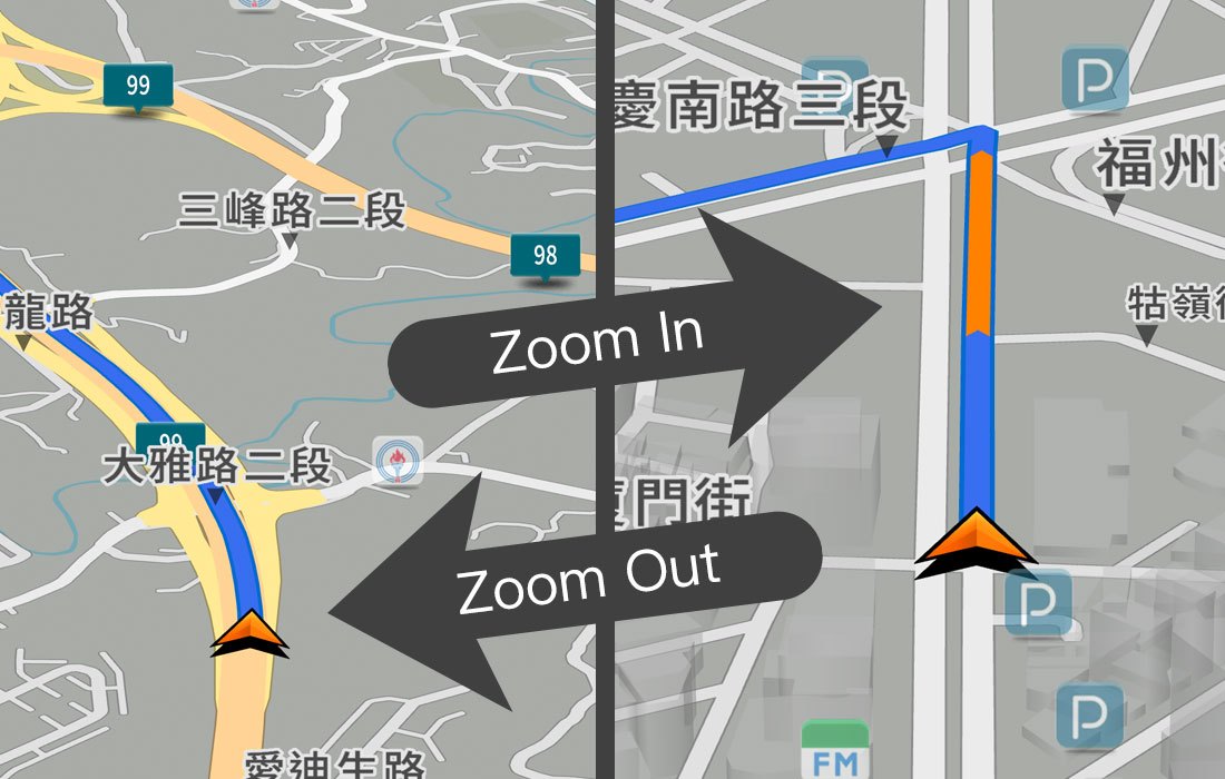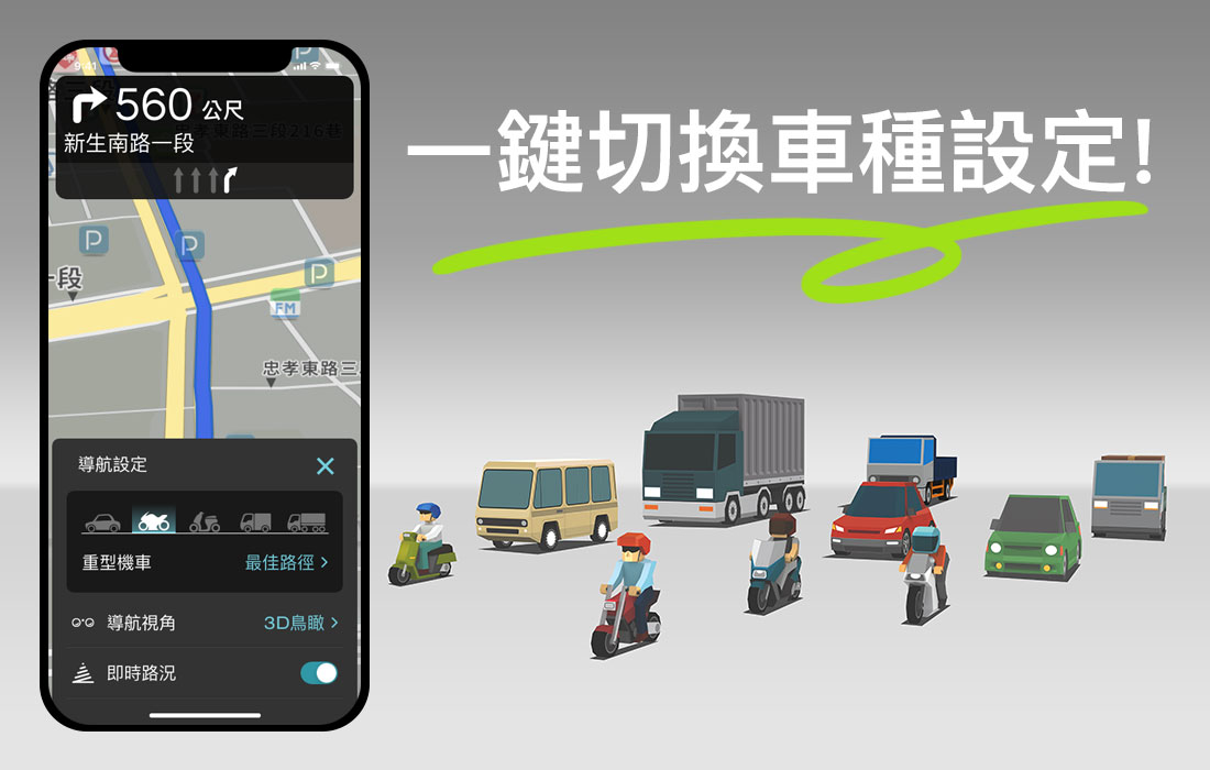 無論是地圖上瀏覽,或導航過程中,讓你輕鬆切換車種(客車、重型機車、一般機車、貨車、大貨車),一鍵點下去就搞定!