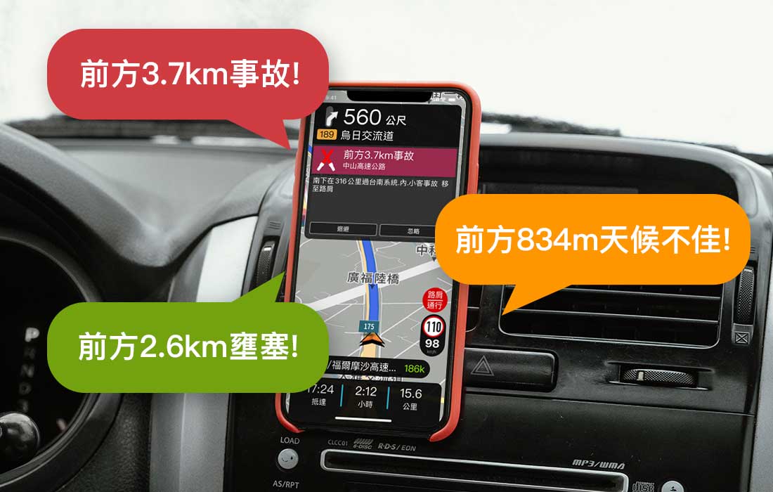 行駛國道時,任何突發狀況,都可能影響您的重要行程,放心!導航王TM為您時時監控前方路況!